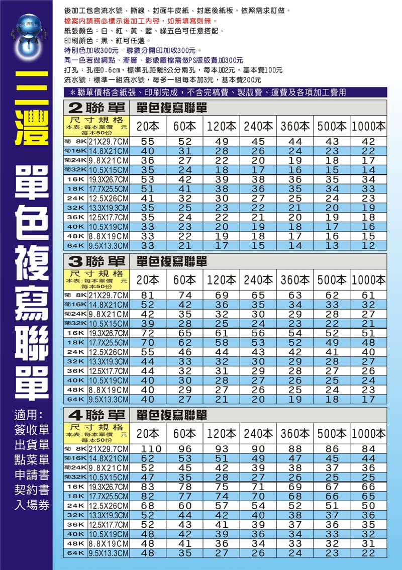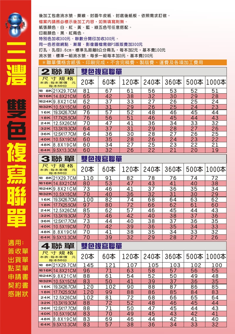 流水號:標準一組流水號,每多一組每本加3元,基本費200元